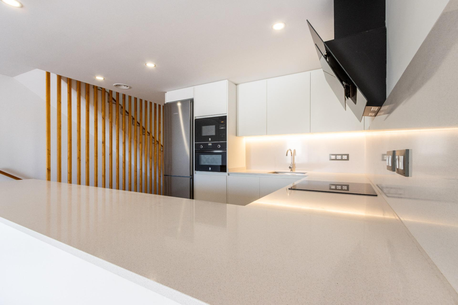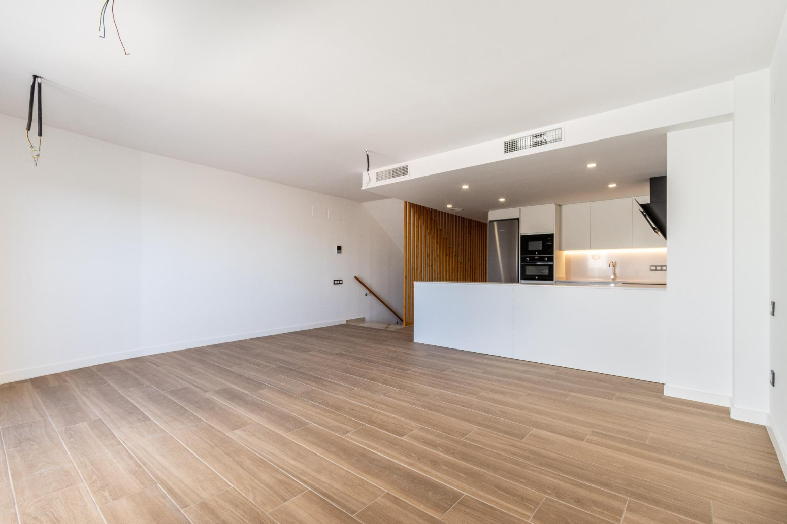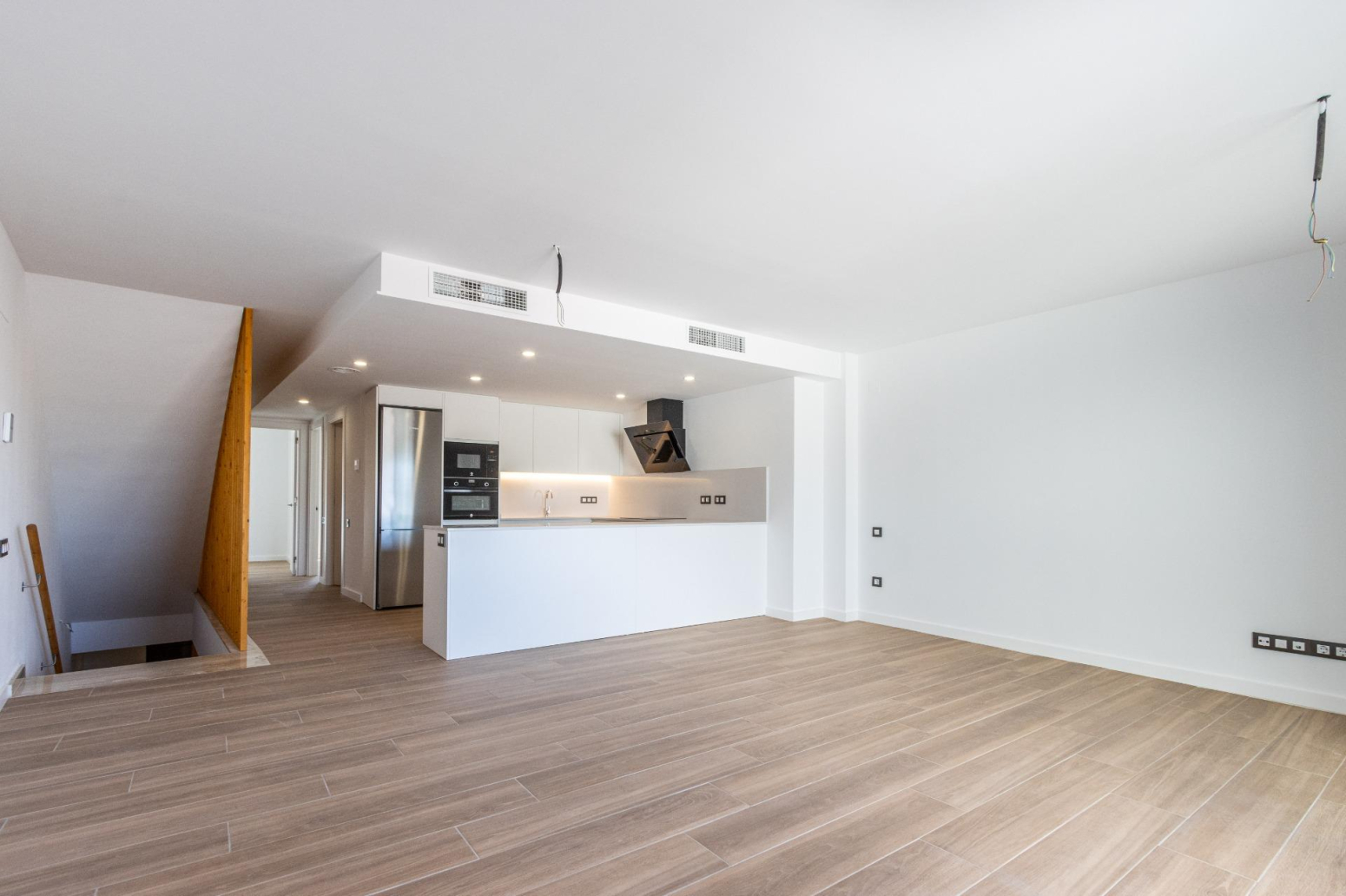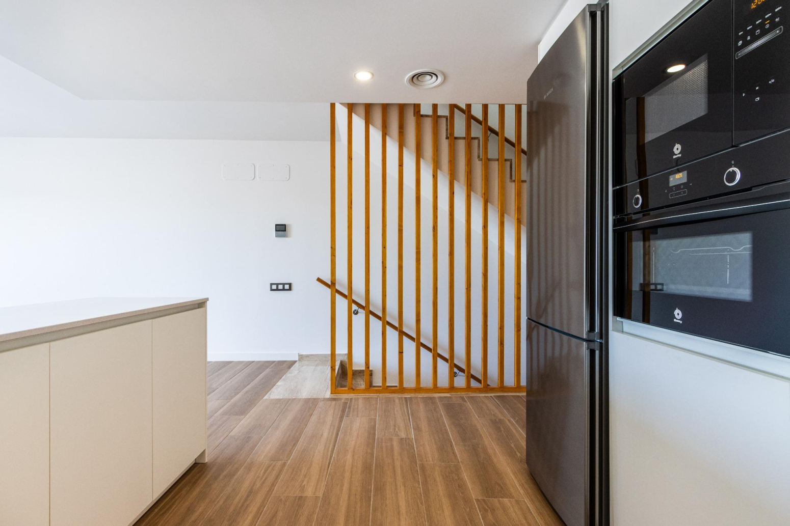 Des del rebedor, unes escales ens porten a la primera planta, on es troba l’impressionant saló-menjador. Aquest gran espai diàfan ofereix vistes espectaculars i compta amb sortida a una àmplia terrassa. A més, disposa d’una cuina espaiosa oberta de disseny modern i elegant, completament equipada amb electrodomèstics d’alta gamma.