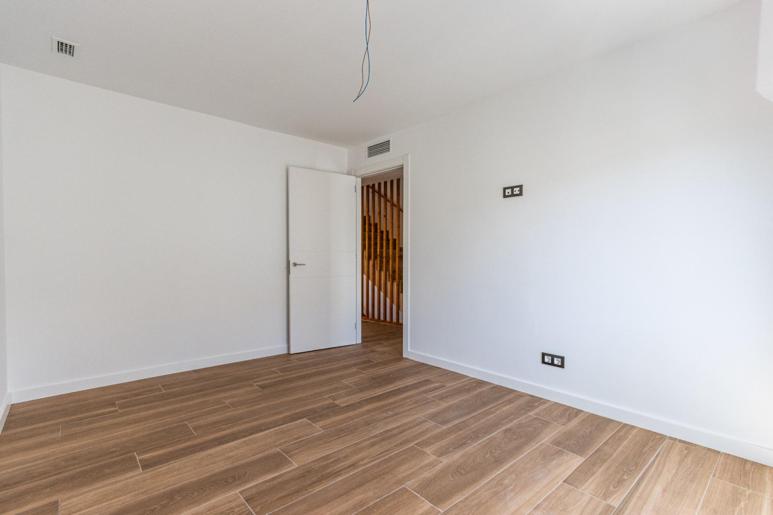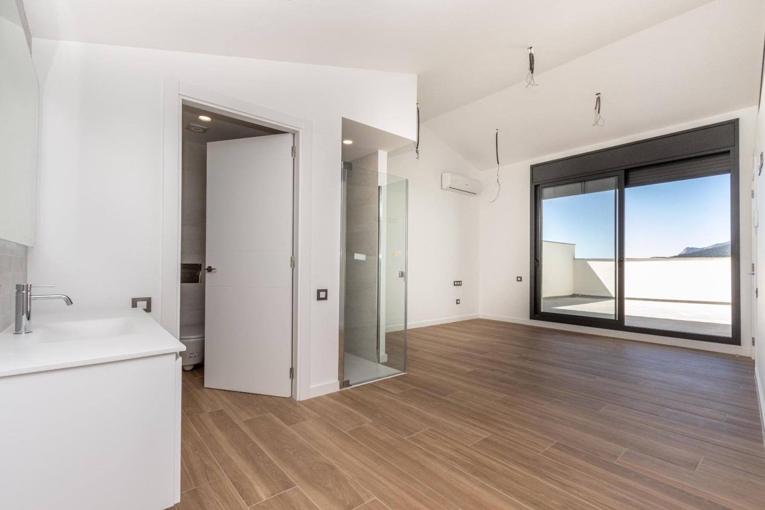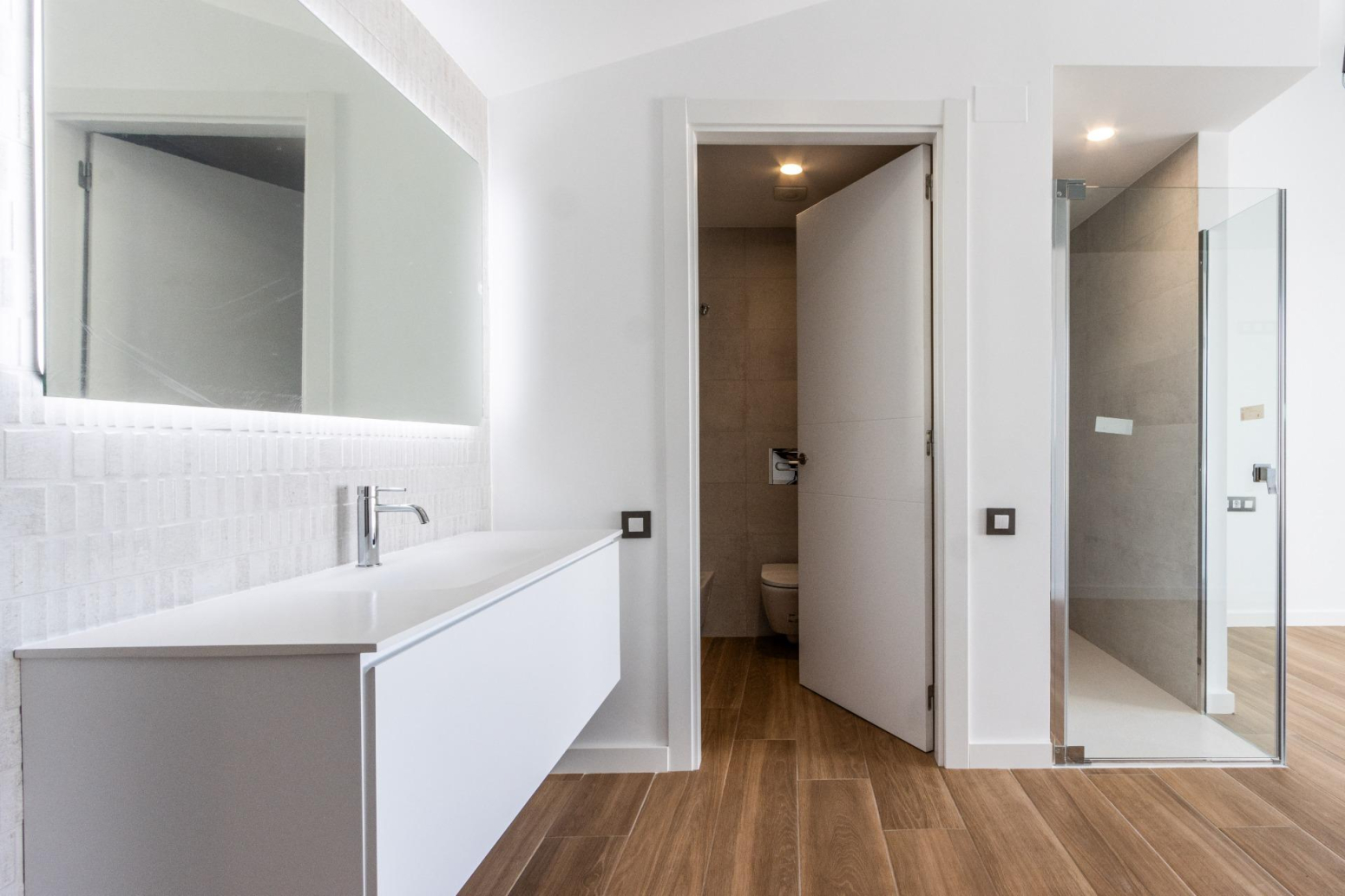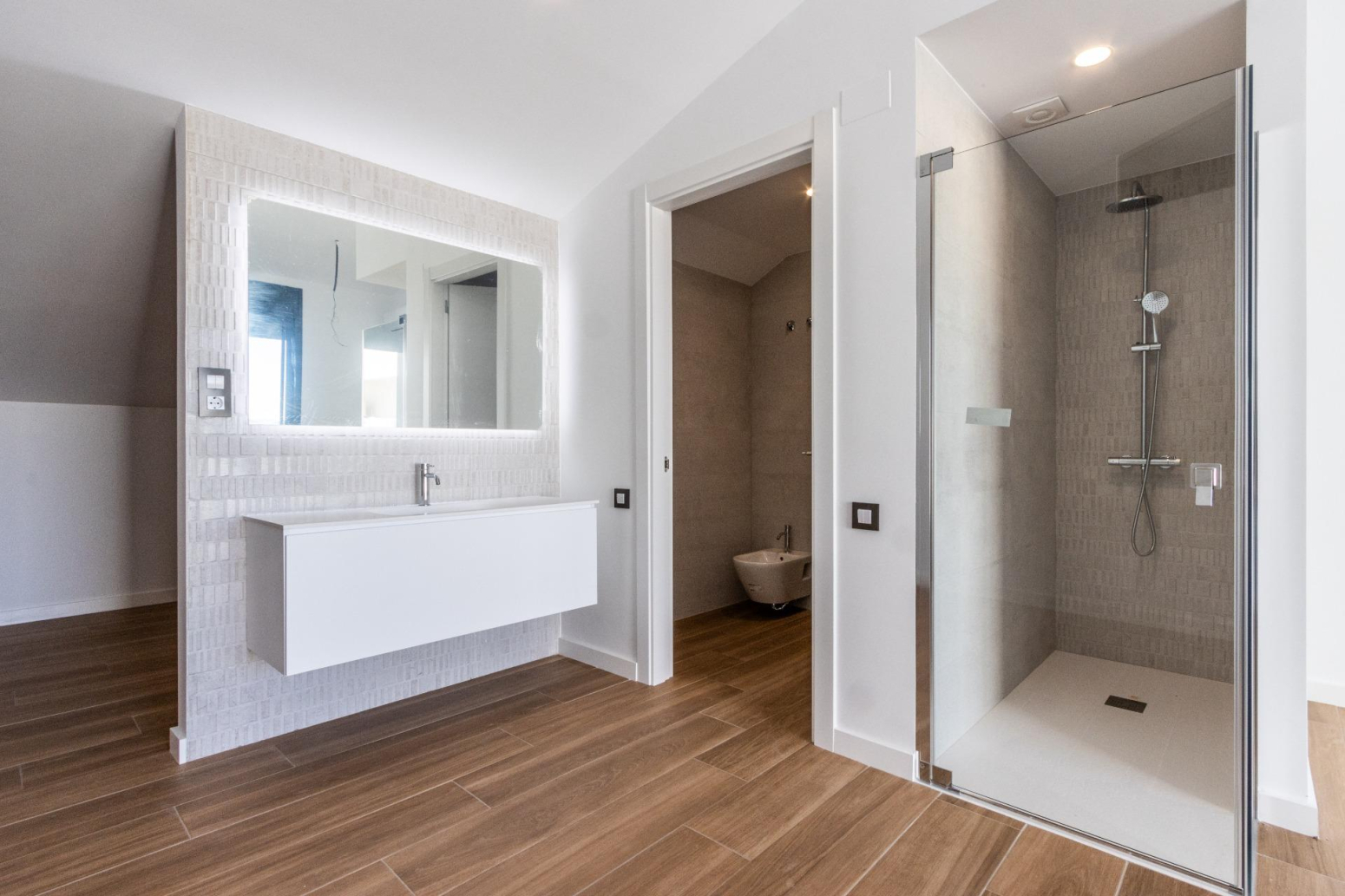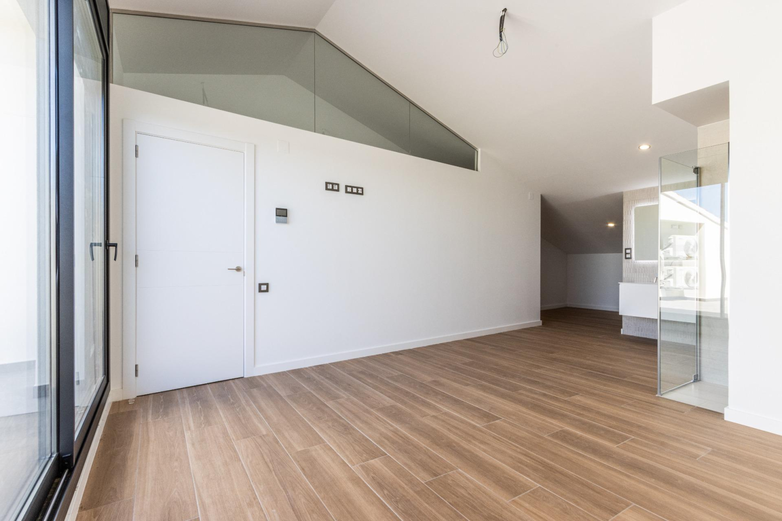 A la segona planta, un altre tram d’escales desemboca en una habitació amb bany en suite i vestidor, que també compta amb sortida a una gran terrassa amb vistes panoràmiques. Aquest espai destaca per la seva privacitat, lluminositat i amplitud, gràcies al gran finestral que dóna accés a la terrassa i l’altura del sostre a dues aigües, convertint-lo en una estança realment exclusiva.