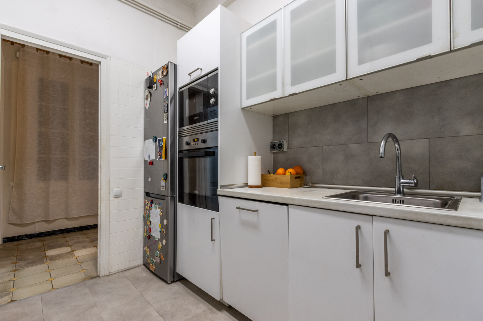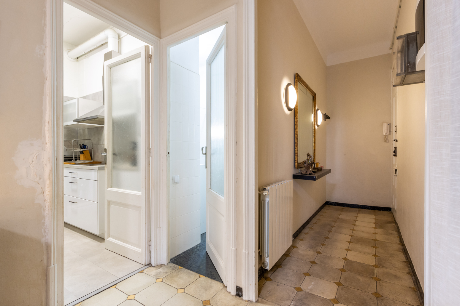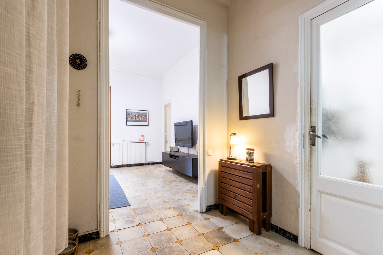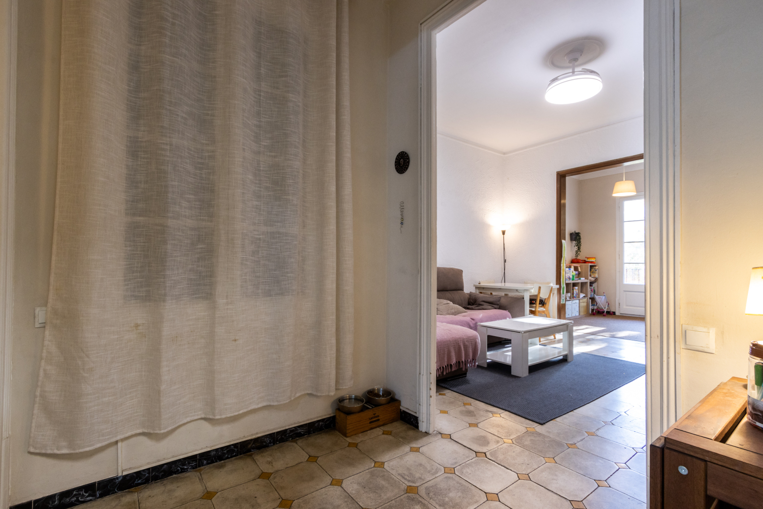 En accedir a l’immoble, un rebedor de 6 m² dóna la benvinguda i condueix a un bany complet de 7 m², ampli i confortable. A continuació, trobem una cuina independent de 6 m², funcional i ben aprofitada, amb sortida a un pati interior de 3,2 m², on s’ubica el rentador, aportant comoditat i ordre a la llar.