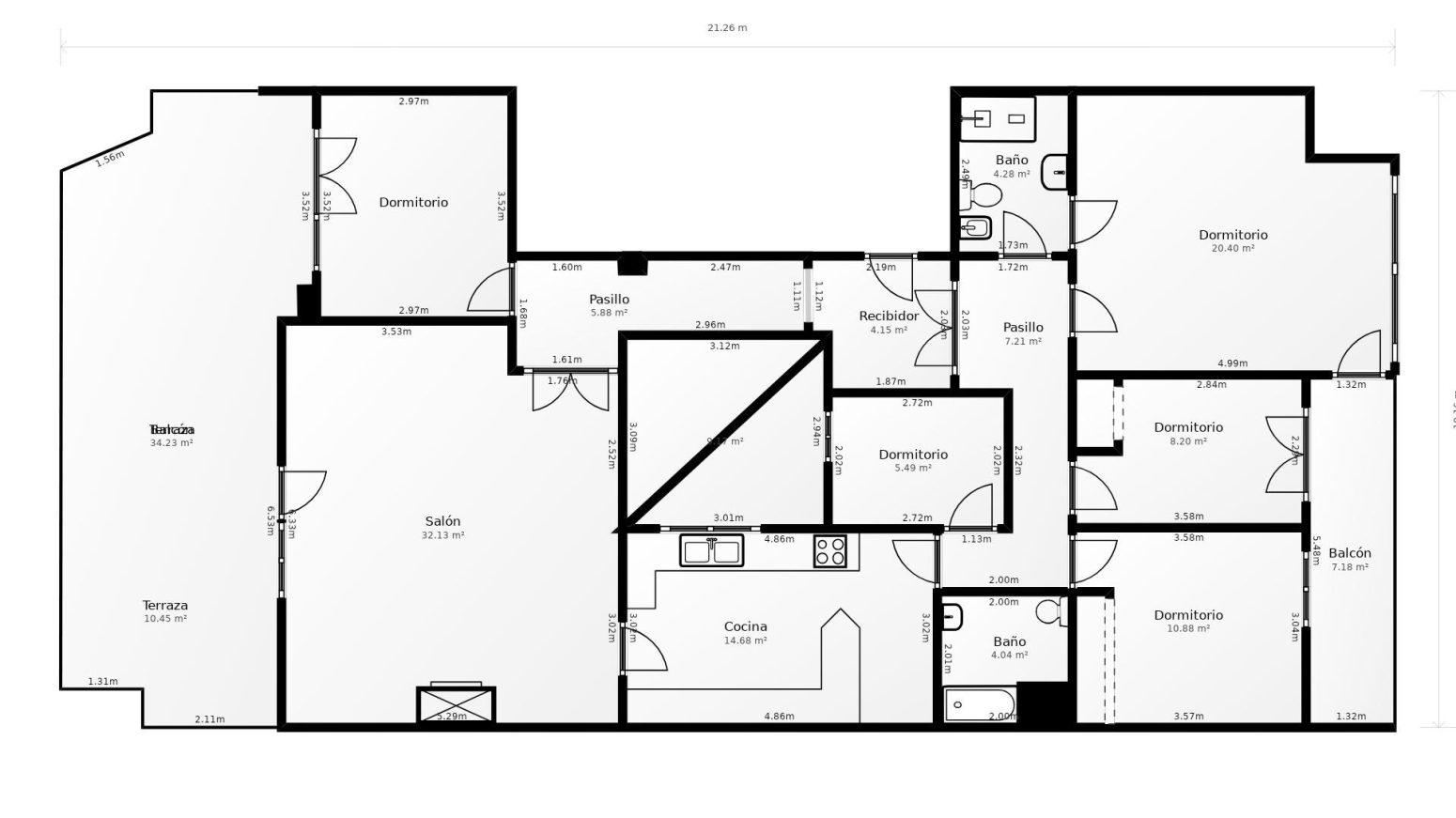 La vivenda té un total de 145 m² construïts, dels quals 140 m² són habitables. La distribució és perfecta, ja que les zones de nit estan separades de la zona de dia. En total, trobem 5 habitacions, de les quals 3 són dobles, així com 2 banys complets. La gran sala d’estar compta amb sortida directa a una espectacular terrassa de 35 m². La cuina és àmplia i disposa d’espai suficient per menjar i fer vida.