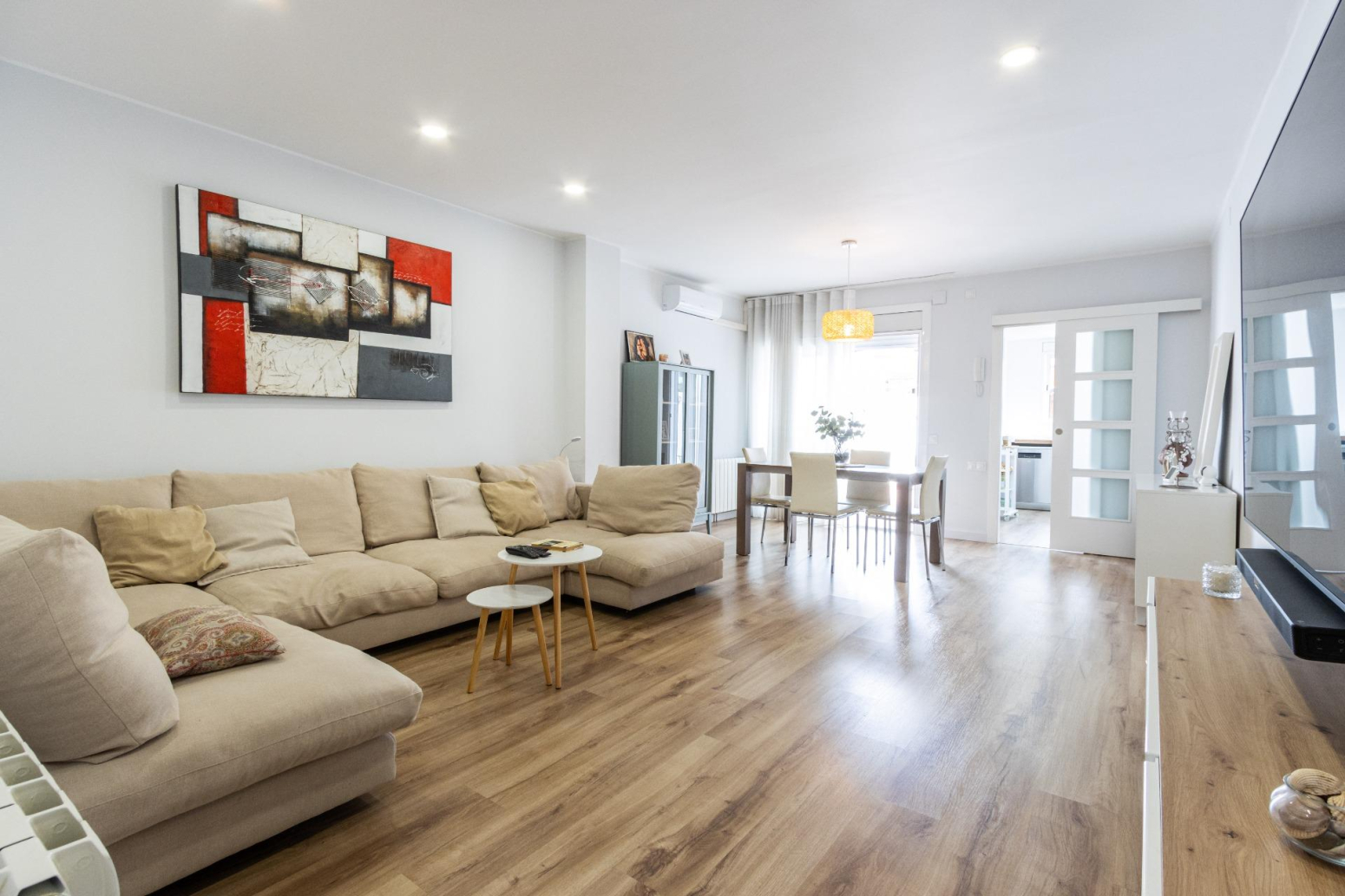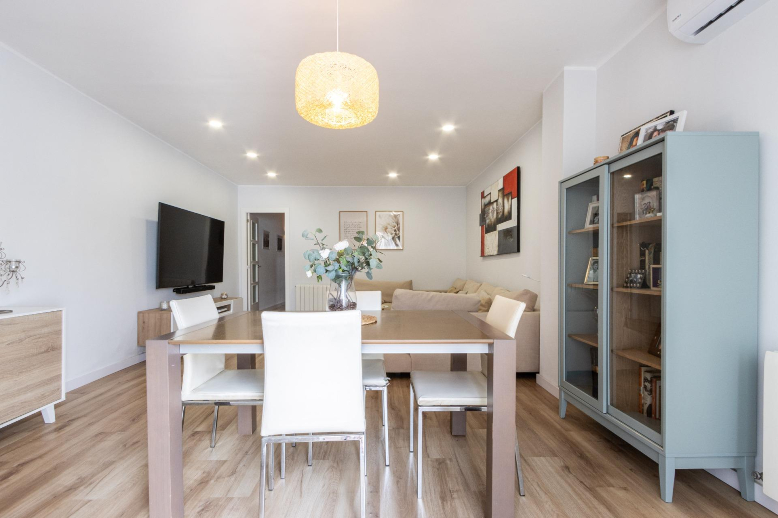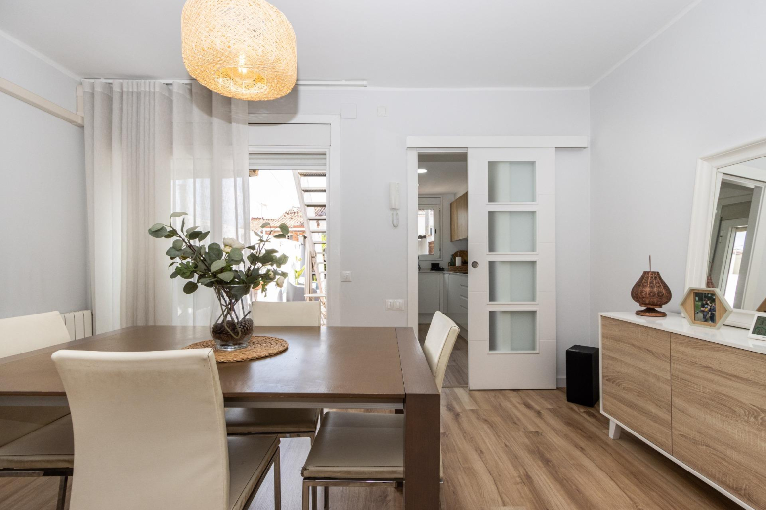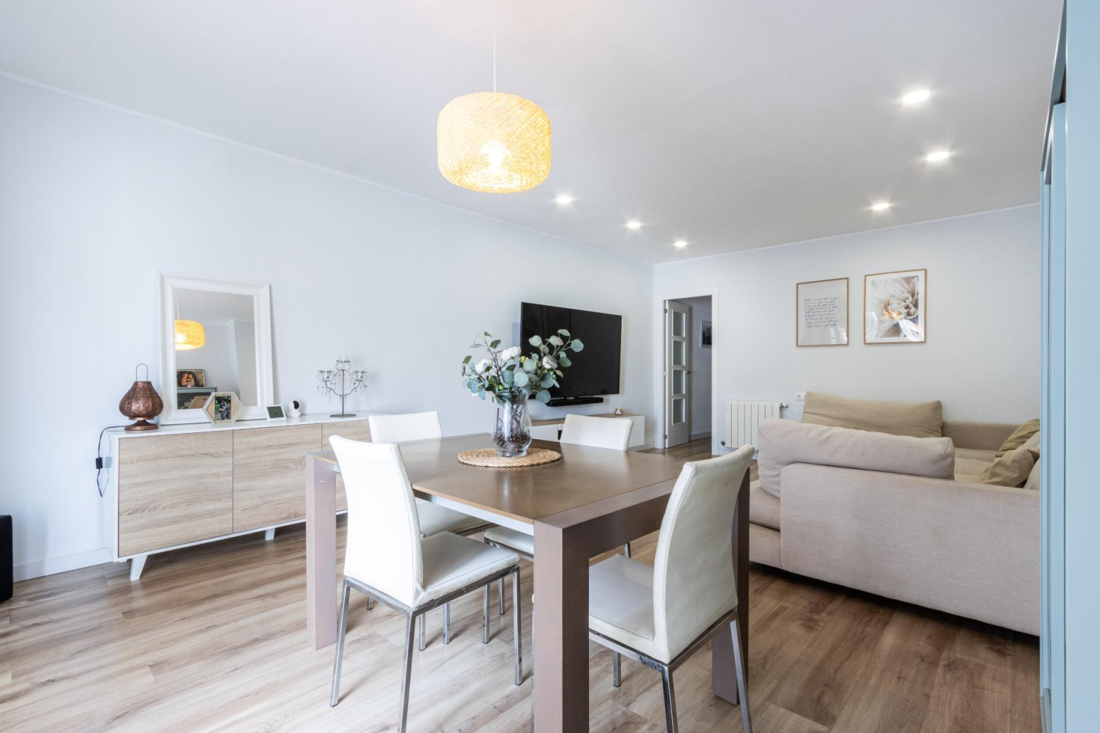 La reforma i decoració d’aquesta vivenda potencien l’amplitud de l’espai i la continuïtat visual, utilitzant tons i teixits neutres. Les portes de color blanc incrementen la lluminositat, creant un ambient acollidor.