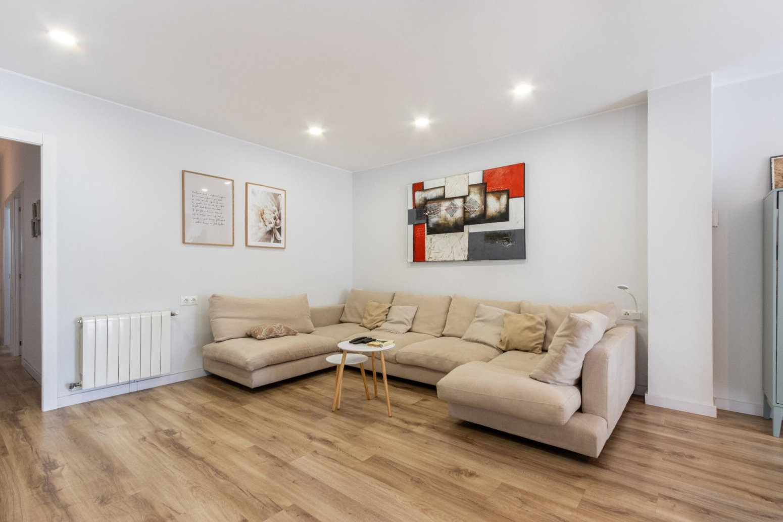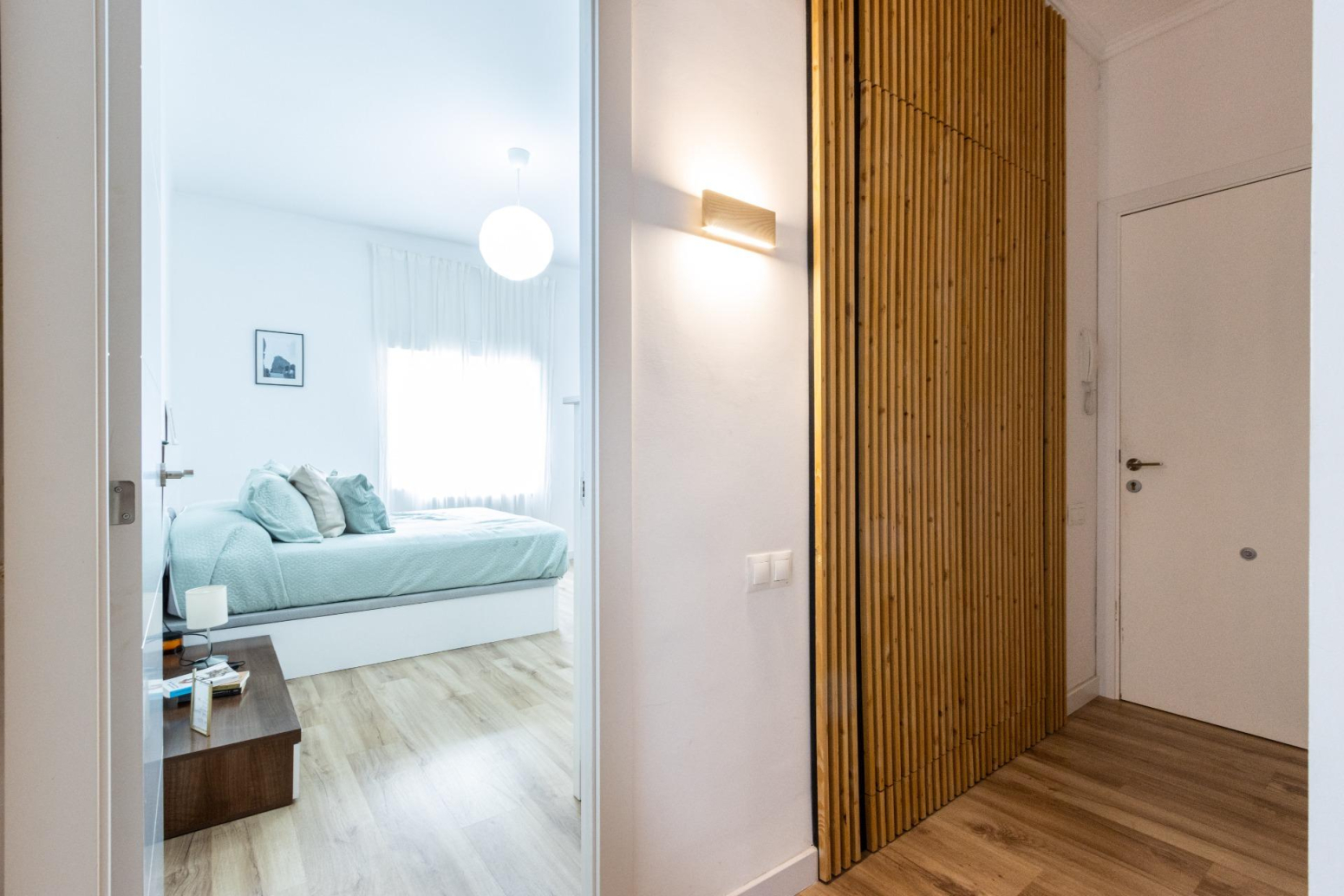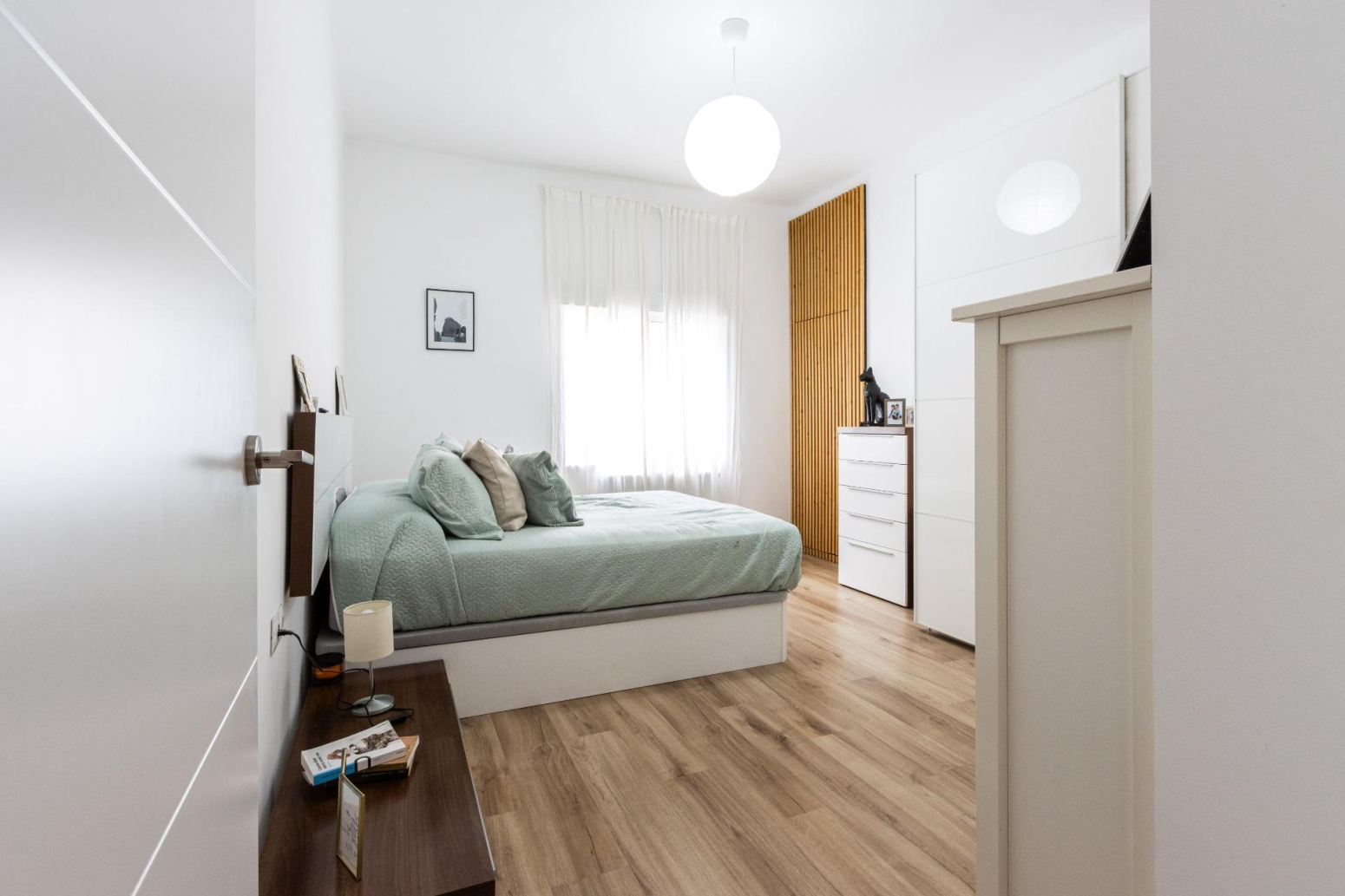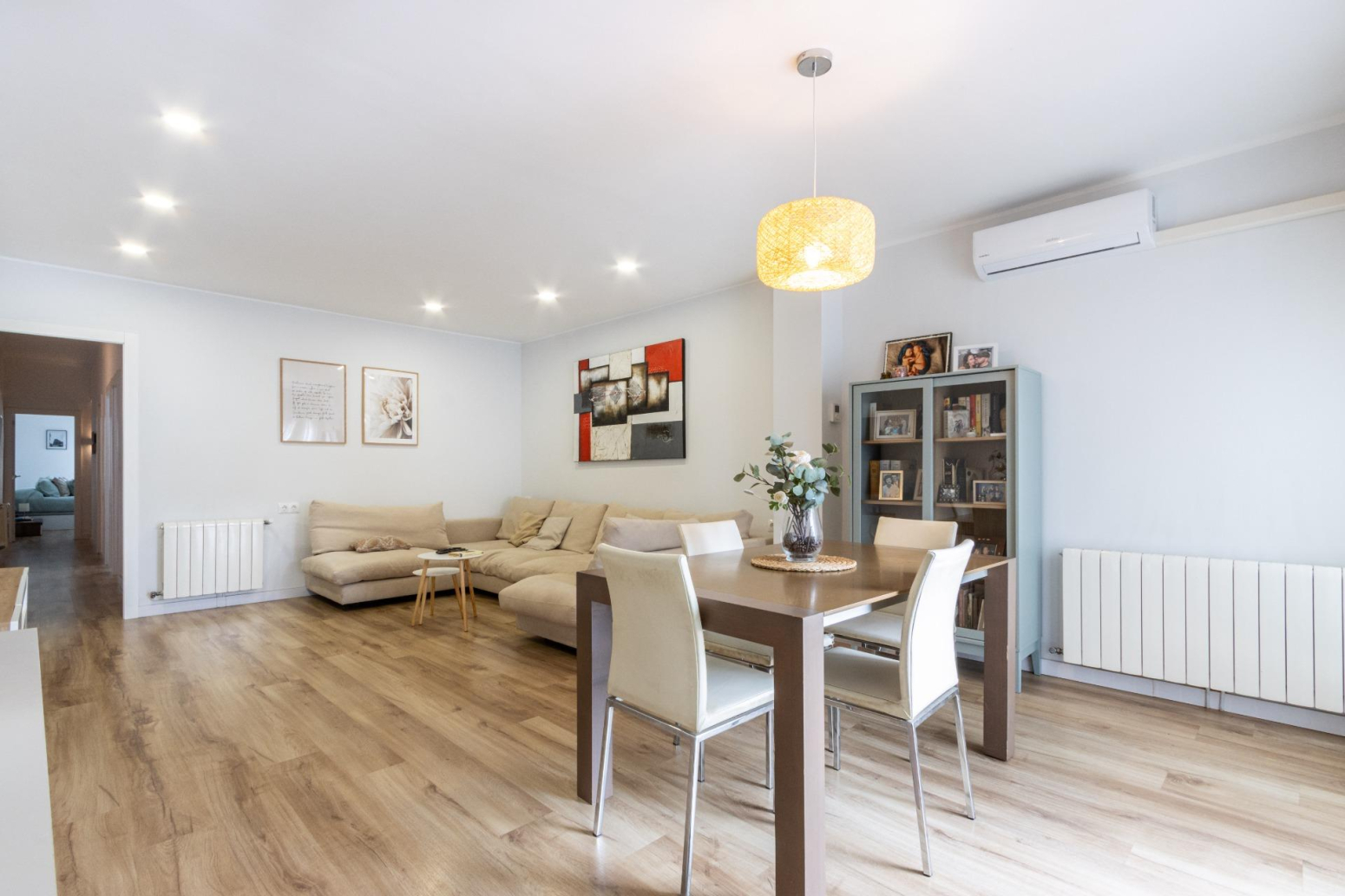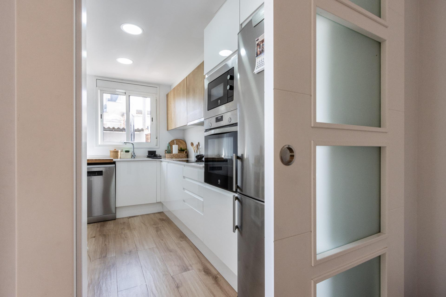 La reforma i decoració d’aquesta vivenda potencien l’amplitud de l’espai i la continuïtat visual, utilitzant tons i teixits neutres. Les portes de color blanc incrementen la lluminositat, creant un ambient acollidor.