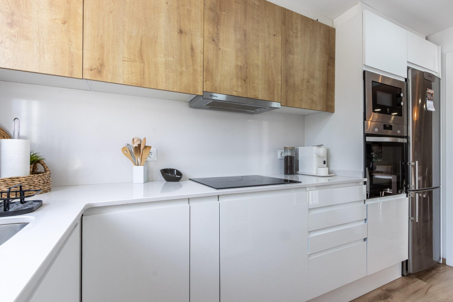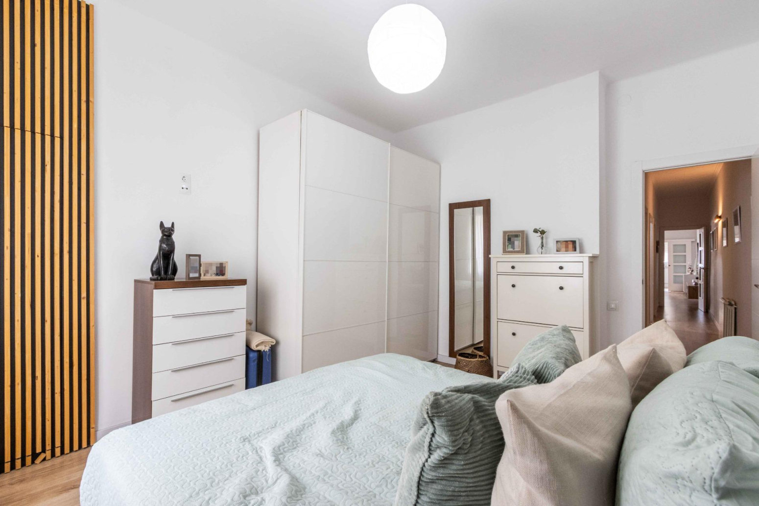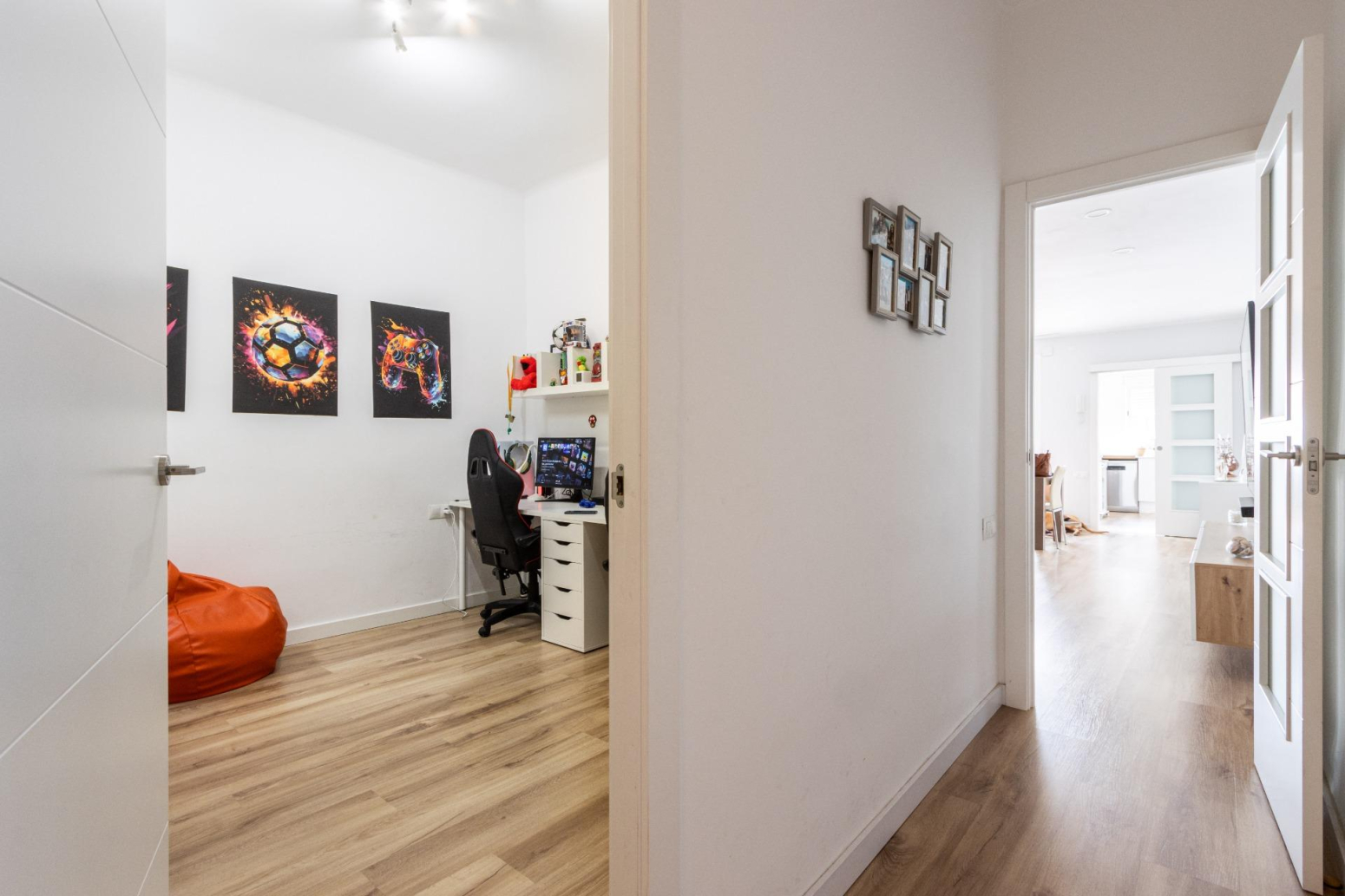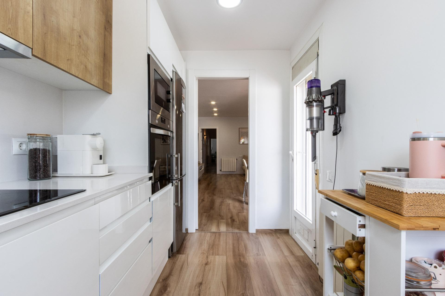 La reforma i decoració d’aquesta vivenda potencien l’amplitud de l’espai i la continuïtat visual, utilitzant tons i teixits neutres. Les portes de color blanc incrementen la lluminositat, creant un ambient acollidor.