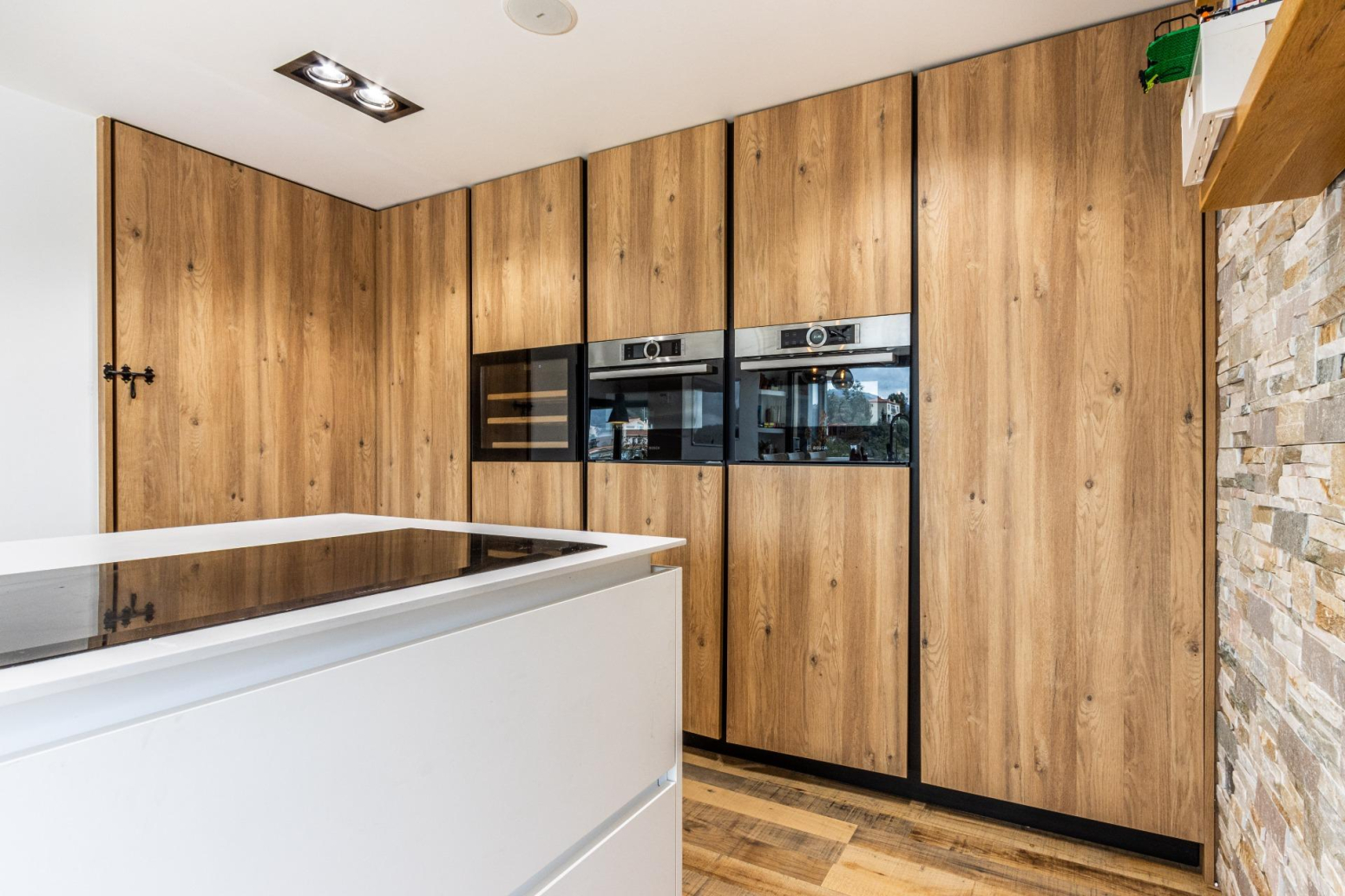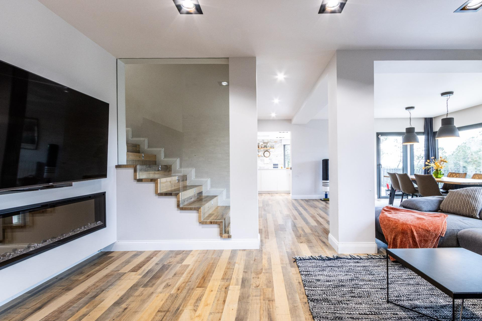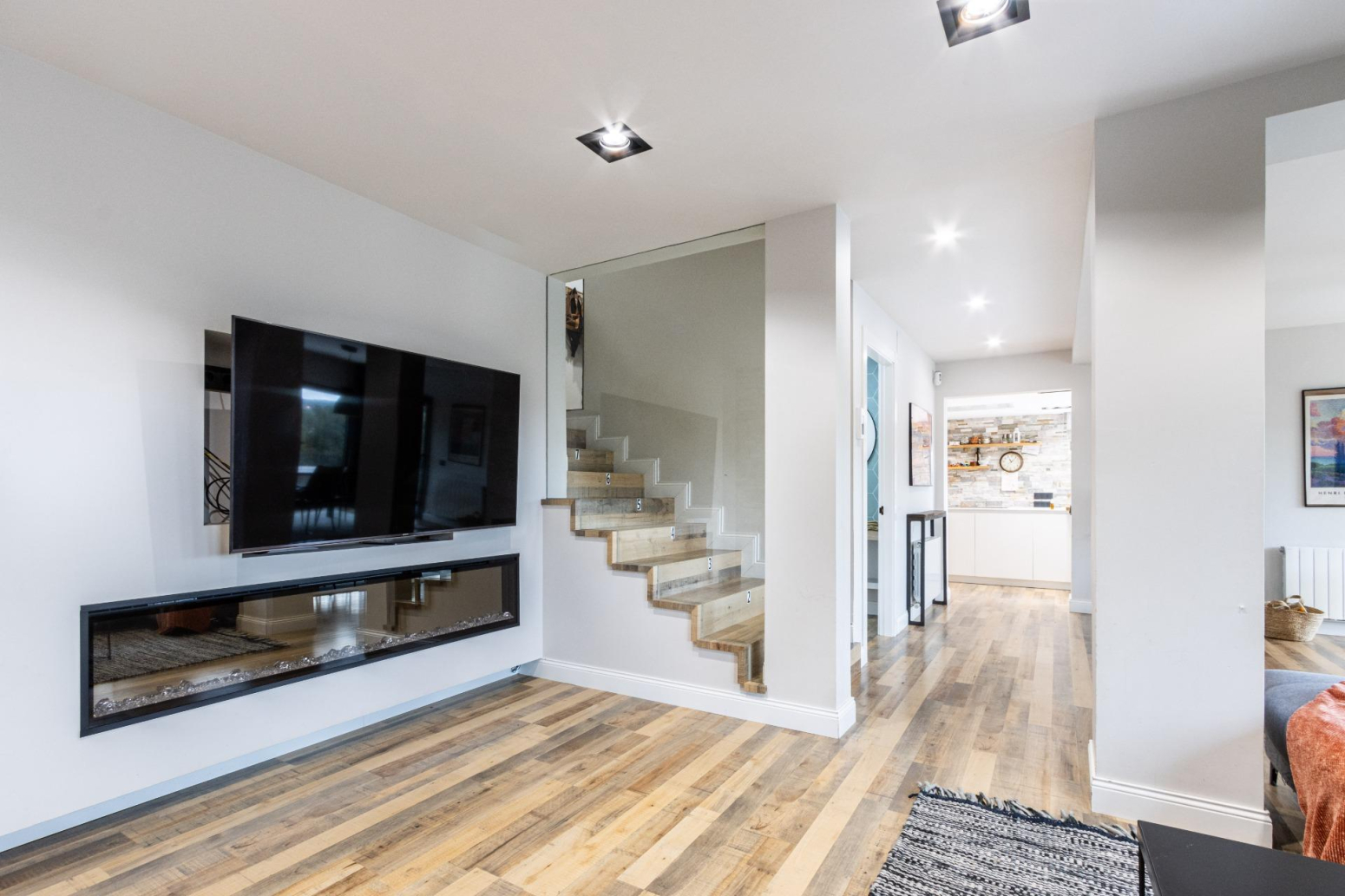 En entrar, trobem un rebedor que dóna accés a una habitació doble, al garatge i, baixant uns pocs esglaons, al ampli saló-menjador amb cuina oberta i una illa. Aquest espai destaca per les seves fabuloses vistes panoràmiques a través de grans parets acristalades i enormes finestrals, a més de comptar amb sortida a una espectacular terrassa. El saló està equipat amb una xemeneia elèctrica que s’activa amb comandament a distància, proporcionant calidesa i confort.