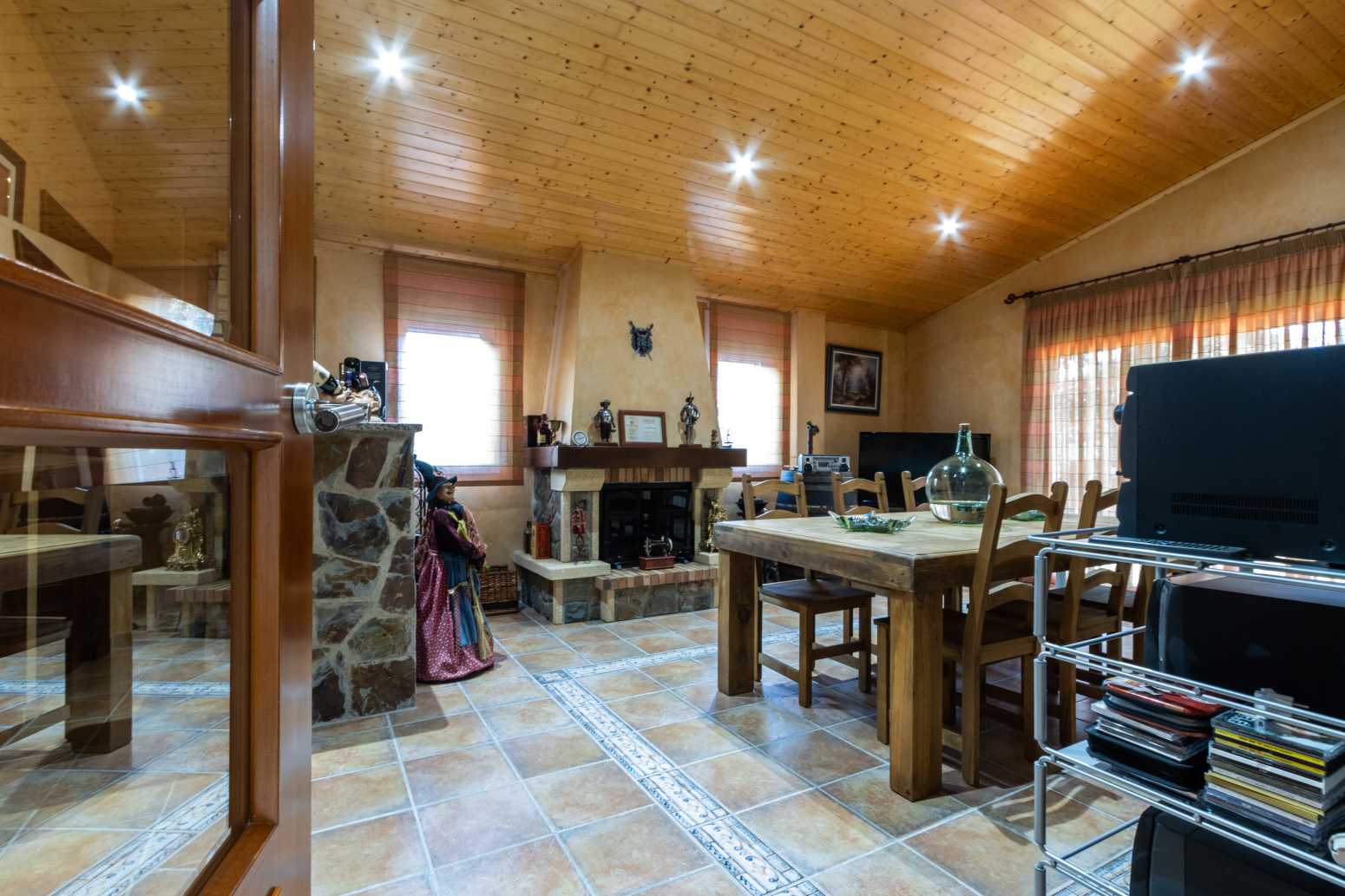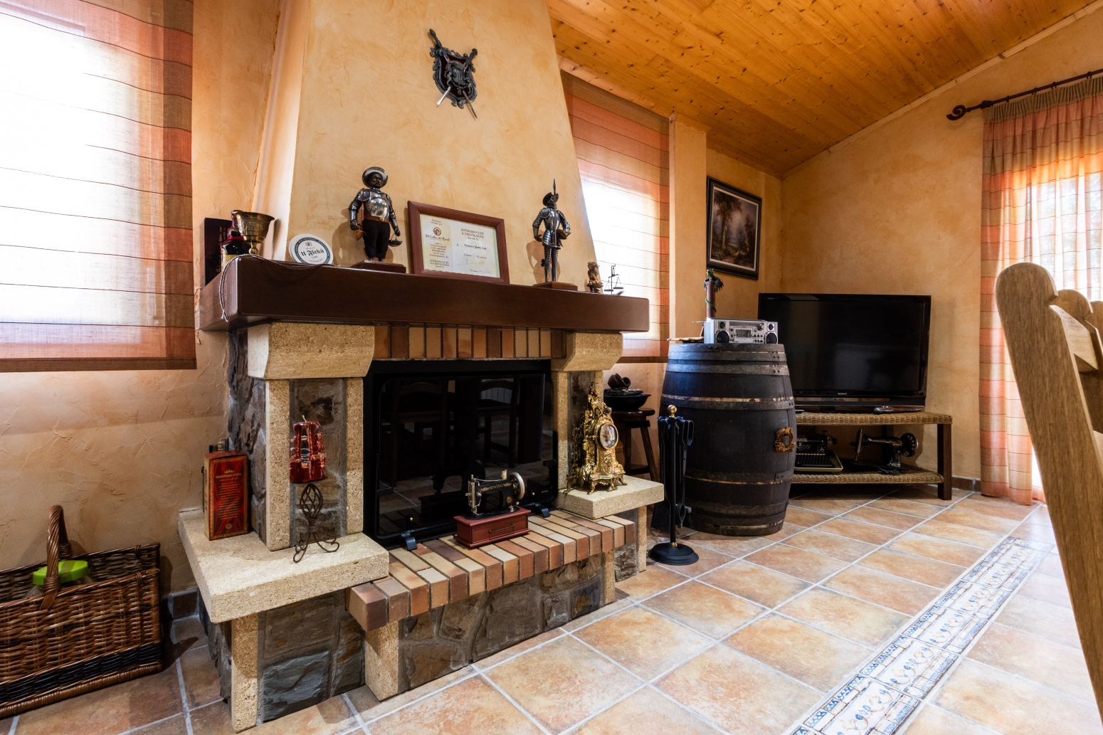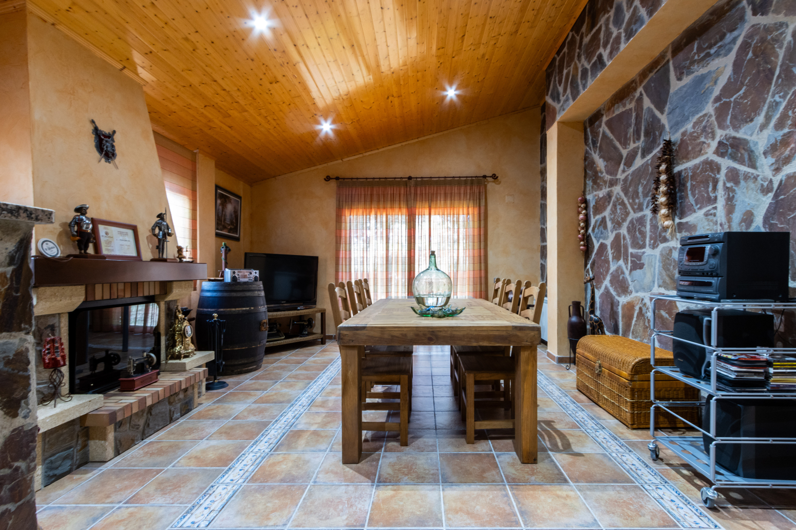 - Acollidor saló-menjador d’estil rústic amb xemeneia i barra de bar