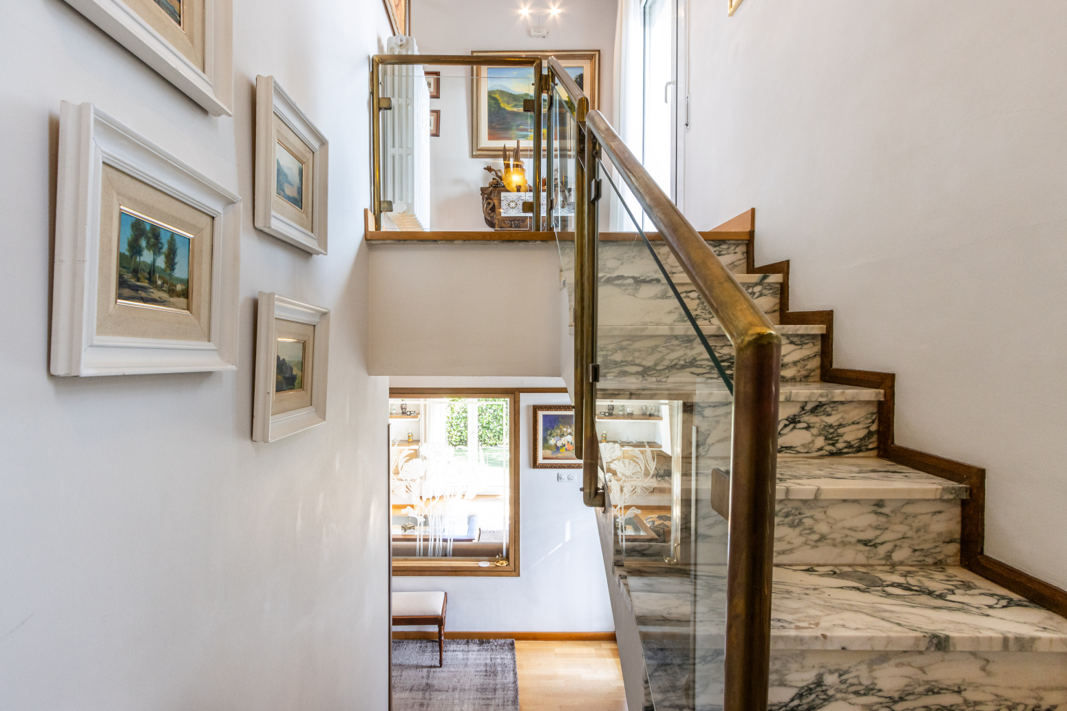 Per una elegant escala de marbre s’accedeix a la planta pis, on trobem: