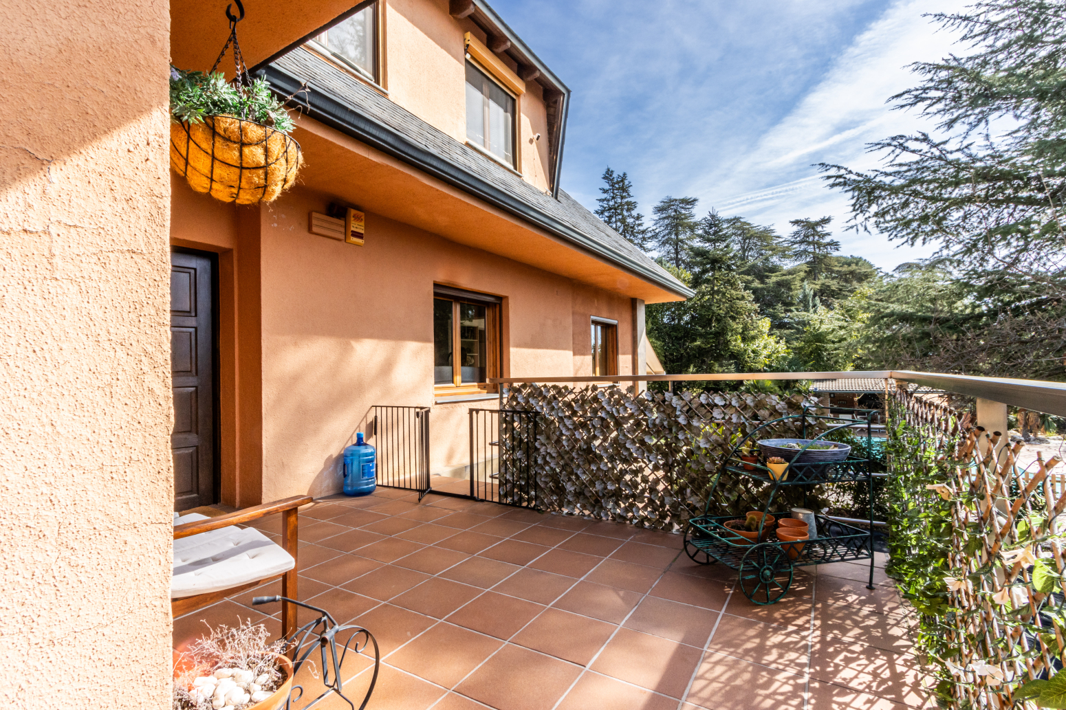 Un element que crida l’atenció de l’exterior de la finca és la magnífica zona de jocs infantils, on els petits de la casa poden gaudir a les seves anxes. La gran piscina d’aigua salina predomina al jardí, complementant-se amb un ampli porxo equipat amb: